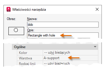 Wprowadź opis, np. Prostokąt z krzyżykiem dla pliku aaa i Prostokąt z otworem dla pliku bbb. Opisy będą pełniły rolę etykiet narzędzi.