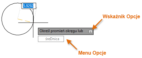 Ta ikona wskazuje, że dostępne są inne opcje. Kliknięcie strzałki w dół lub naciśnięcie klawisza strzałki w dół podczas wyświetlania monitu dotyczącego promienia spowoduje pojawienie się menu z opcją Średnica. Wybranie opcji Średnica pozwala określić średnicę okręgu zamiast promienia. Po wyświetleniu menu można przełączać dostępne opcje, naciskając klawisze strzałek w dół i w górę lub za pomocą urządzenia wskazującego.