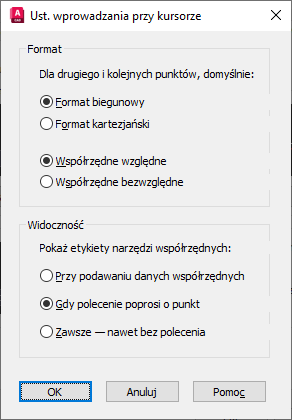 Ustawienia w obszarze Wprowadzanie przy kursorze wpływają na sposób wprowadzania wartości współrzędnych, gdy aktywne jest wprowadzanie dynamiczne. Kliknij opcję Ustawienia, aby otworzyć okno dialogowe Ustawienia wprowadzania przy kursorze.