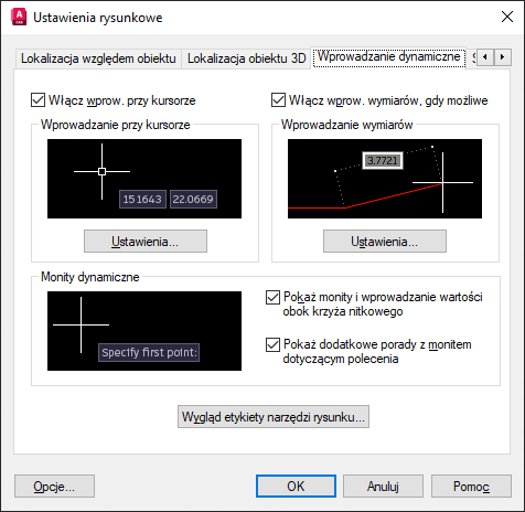 Ustawienia wprowadzania dynamicznego można znaleźć na karcie Wprowadzanie dynamiczne okna dialogowego Ustawienia rysunkowe (polecenie USTAWIENIARYS). Kartę Wprowadzanie dynamiczne okna dialogowego Ustawienia rysunkowe można wyświetlić, wykonując jedną z poniższych czynności:
