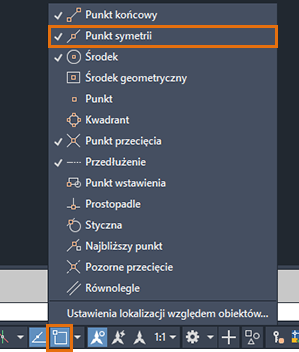 W tym ćwiczeniu użyjemy opcji lokalizacji względem obiektu Punkt symetrii. Upewnij się, że lokalizacja względem obiektu Punkt symetrii jest włączona.