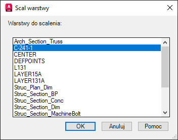Podczas pracy nad rysunkiem może zajść konieczność aktualizacji warstw na rysunku do nowego zestawu standardów lub uproszczenia organizacji warstw rysunku przez zmniejszenie liczby używanych warstw. Funkcja Scalenie warstw (polecenie WARPOŁ) umożliwia przeniesienie wszystkich obiektów z jednej lub kilku wybranych warstw do warstwy docelowej. Nieużywane warstwy są automatycznie czyszczone.