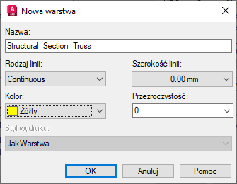 2. W oknie dialogowym Nowa warstwa w polu tekstowym Nazwa wprowadź nazwę Structural_Section_Truss.