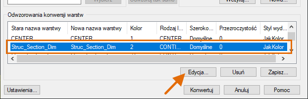 1. W sekcji Zestawienie konwersji warstw wybierz opcję Struc_Section_Dim w kolumnie Nazwa starej warstwy i kliknij przycisk Edytuj.
