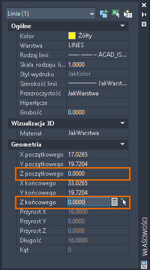 5. W tym przykładzie obiektu typu linia zmień wartości Z początkowego i Z końcowego na 0 (zero).