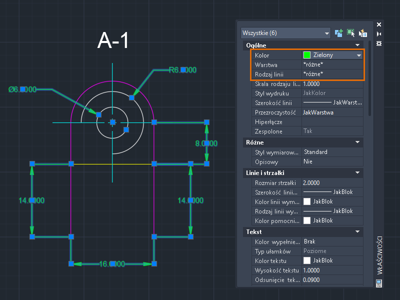 Zmiana właściwości wybranych obiektów na JakWarstwa dziedziczy wartości właściwości bieżącej warstwy. Ponieważ właściwość Kolor wybranych obiektów jest ustawiona na JakWarstwa, obiekty wyświetlają teraz kolor zdefiniowany dla warstwy LINIE.