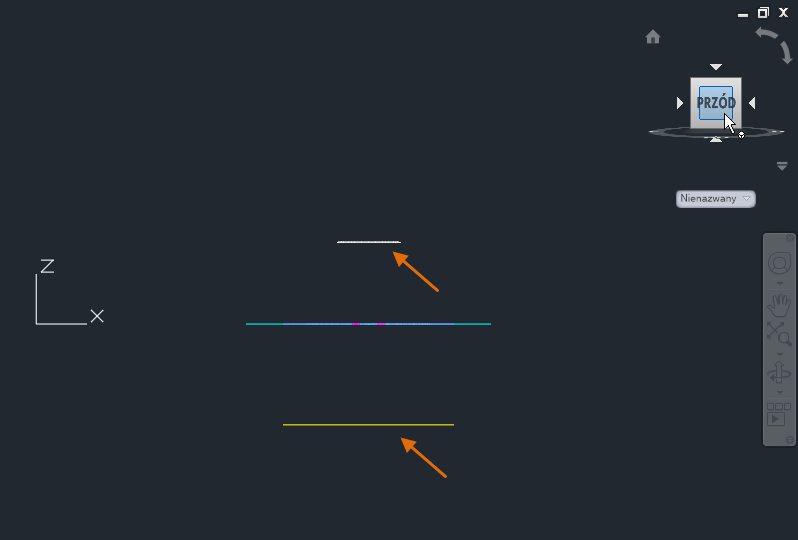 Podczas obracania lub zmiany widoku, np. na widok z przodu, można zobaczyć, że na rysunku faktycznie są obiekty niewspółpłaszczyznowe umieszczone wzdłuż osi Z.