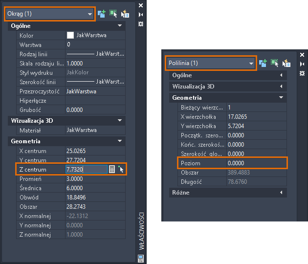 Różne obiekty będą miały różne nazwy właściwości osi Z. Obiekt może mieć jedną właściwość lub połączenie następujących właściwości: Z początkowego, Z końcowego, Z położenia (wtekst), Z centrum (okręgi) lub Poziom (polilinie).