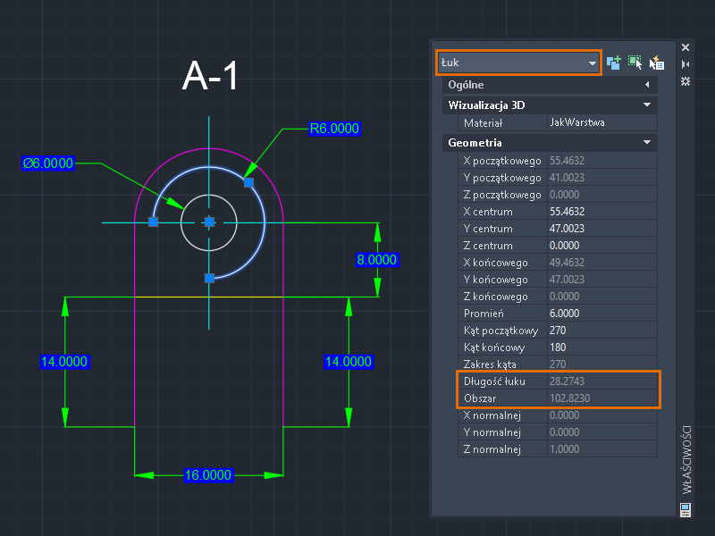 2. Przejrzyj jego właściwości. Obliczony obszar i długość łuku można łatwo znaleźć bez użycia żadnego polecenia.