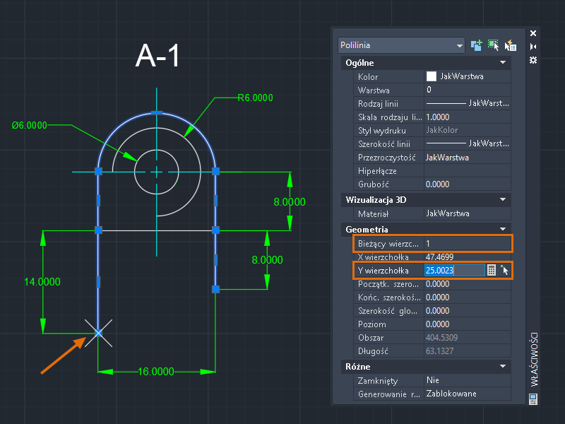 Teraz pierwszy i ostatni wierzchołek polilinii są wyrównane. Ta metoda edycji wierzchołków jest przydatna, gdy użytkownik wie, jakich współrzędnych bezwzględnych oczekuje.