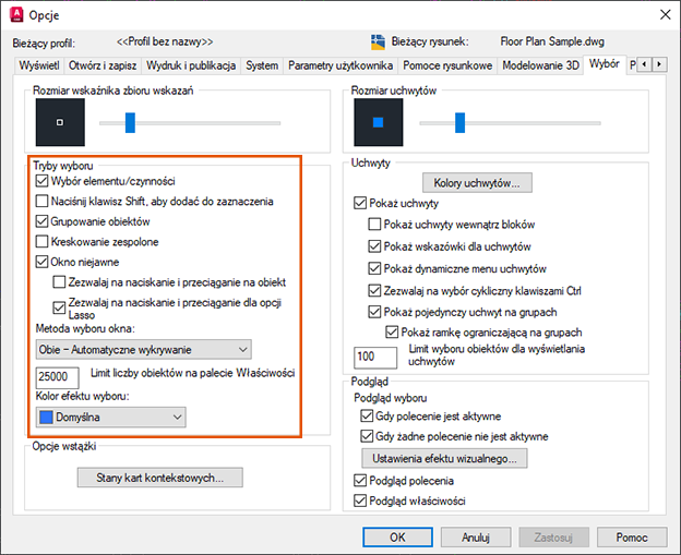Wybór elementu/czynności. (PICKFIRST) Upewnij się, że ta opcja jest zaznaczona, jeśli chcesz najpierw wybrać obiekty, a następnie wybrać polecenie, aby wykonać operacje na tym zbiorze wskazań.