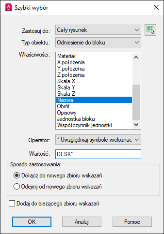 Uwaga: Opcja Nazwa jest zgodna z nazwanymi obiektami, takimi jak nazwy bloków, ale również z typem obiektów nienazwanych, takich jak linie i okręgi.