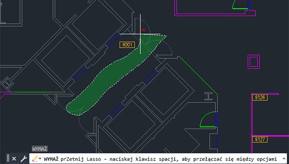 Zauważ, że wiersz polecenia wskazuje, że aktualnie jest używane lasso przecinające, co oznacza wybór wszystkiego, co jest przecięte przez lasso i w nim zawarte.