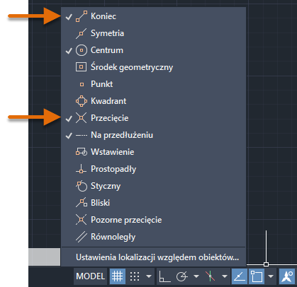 7. Kliknij prawym przyciskiem myszy przycisk Lokalizacja względem obiektu oraz wybierz opcje Punkt końcowy i Przecięcie, jeśli jeszcze nie zostały zaznaczone.