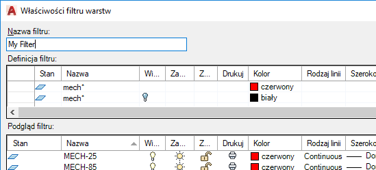 W tym przykładzie filtr właściwości warstw obejmuje warstwy, których nazwy rozpoczynają się od ciągu „mech” i są czerwone, lub warstwy, których nazwy rozpoczynają się od ciągu „ mech”, które są wyłączone i białe.