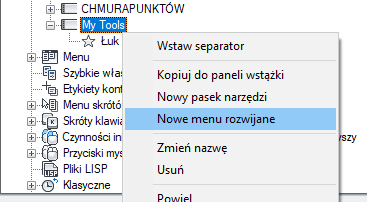 Zostanie utworzony nowy pasek narzędzi (o nazwie Paseknarzędzi1), a nowy przycisk rozwijany odwołujący się niego zostanie umieszczony na dole wybranego paska narzędzi.