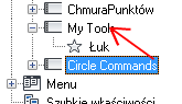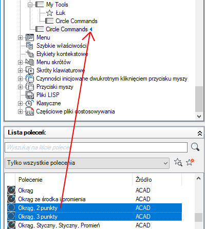 4. W panelu Lista poleceń przeciągnij polecenie, które chcesz dodać do przycisku rozwijanego paska narzędzi w panelu Dostosowywanie w <nazwa pliku>.