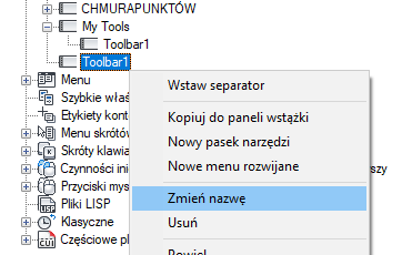 3. Kliknij prawym przyciskiem myszy pasek narzędzi o nazwie Paseknarzędzi1, a nie menu rozwijane. Kliknij opcję Zmień nazwę i wprowadź nową nazwę.