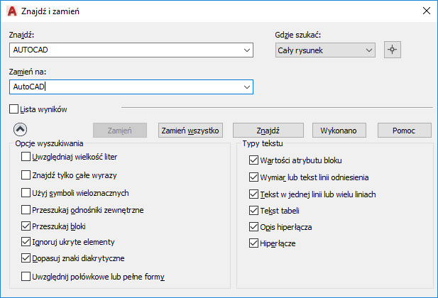Ustawienie funkcji Znajdź gdzie określa, czy tekst do zamiany ma być wyszukiwany w całym rysunku czy w aktualnie wybranych obiektach.