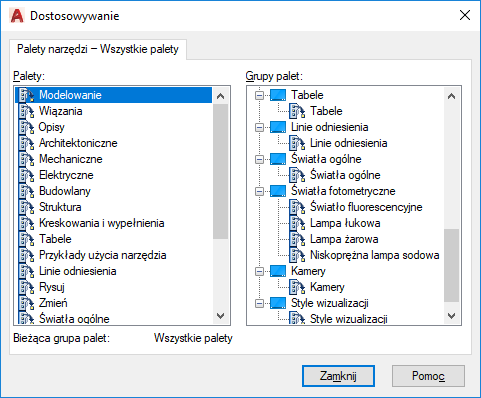 Wyświetla listę wszystkich dostępnych palet narzędzi.