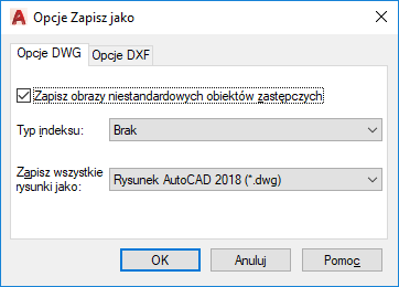 Jeśli plik jest zapisywany w formacie wcześniejszej wersji lub rysunek zawiera obiekty niestandardowe z innej aplikacji, wybierz opcję Zapisz obrazy niestandardowych obiektów zastępczych, aby zapisać obrazy obiektów niestandardowych w pliku rysunku. (PROXYGRAPHICS — zmienna systemowa)