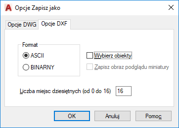 Określa, czy zostanie utworzony plik ASCII czy binarny DXF. Pliki DXF w formacie ASCII mogą być wczytane do edytora tekstowego i są kompatybilne z szerszym zakresem aplikacji. Pliki DXF w formacie binarnym mają mniejszy rozmiar. Odczyt i zapis plików w formacie binarnym jest szybszy niż w przypadku plików w formacie ASCII.