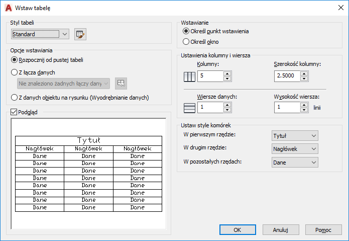 Z bieżącego rysunku należy wybrać styl tabeli, który posłuży do utworzenia tabeli. Nowy styl tabeli można utworzyć, klikając przycisk obok listy rozwijanej.