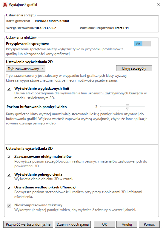 - Umożliwia użycie przyspieszenia sprzętowego i sterowanie wszystkimi ustawieniami efektów dostępnymi dla bieżącego sterownika. Gdy jest wyłączone, jedynie opcja wyświetlania linii gładkich jest aktywna, a oprogramowanie przechodzi w tryb domyślny.