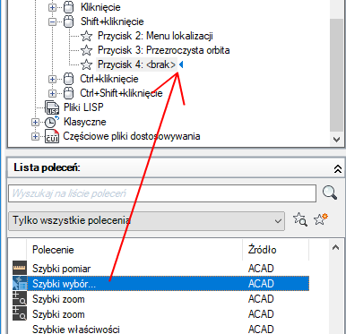 W panelu Lista poleceń przeciągnij polecenie, które chcesz dodać do przycisku myszy w panelu Dostosowywanie w