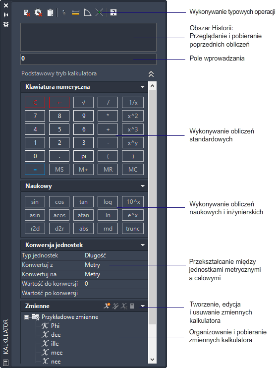 Kalkulator oprócz podstawowych funkcji występujących w kalkulatorach naukowych zawiera funkcje geometryczne, konwersje jednostek i zmienne.