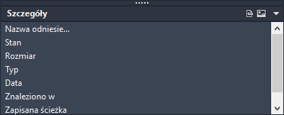 Podczas korzystania z trybu Szczegóły podawane są właściwości zaznaczonego odniesienia pliku. Każde odniesienie pliku ma podstawowy zestaw właściwości, a dla niektórych odniesień pliku, jak np. obrazy z odnośnika, są wyświetlane właściwości specyficzne dla danego typu pliku. Podstawowy zestaw właściwości zawiera takie informacje jak: nazwa odnośnika, stan, rozmiar pliku, typ pliku, data utworzenia, zapisana ścieżka, ścieżka odnalezionego pliku oraz wersja pliku, jeśli jest zainstalowany klient programu Autodesk Vault (niedostępny w programie AutoCAD LT). Niektóre właściwości można edytować.