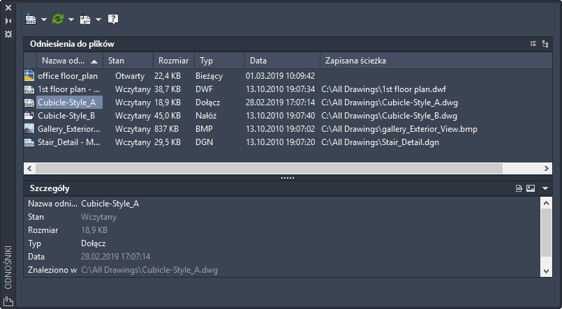 Wyświetla listę odniesień w bieżącym rysunku, w tym takie informacje jak stan, rozmiar i data utworzenia pliku.