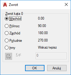 Ustala kierunek kąta zero. Podane opcje wpływają na wprowadzanie kątów, format wyświetlania i wprowadzanie współrzędnych biegunowych, walcowych i sferycznych.
