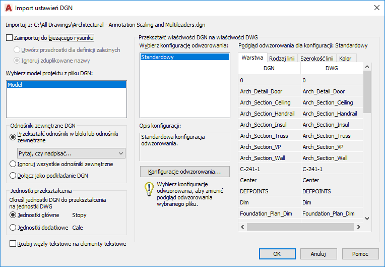 Standardowa to domyślna konfiguracja odwzorowania, która wyodrębnia dane z eksportowanego rysunku i stosuje automatyczne odwzorowanie na warstwy DGN, rodzaje linii, szerokości linii oraz kolory, co jest widoczne na podglądzie odwzorowania.