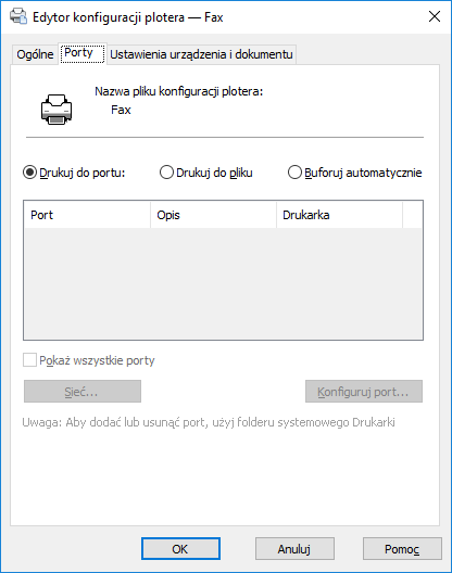 Wyświetla wszystkie dostępne w komputerze porty, niezależnie od portów dostępnych dla plotera.