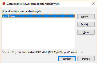 Umożliwia dodanie istniejącego słownika niestandardowego z list plików.
