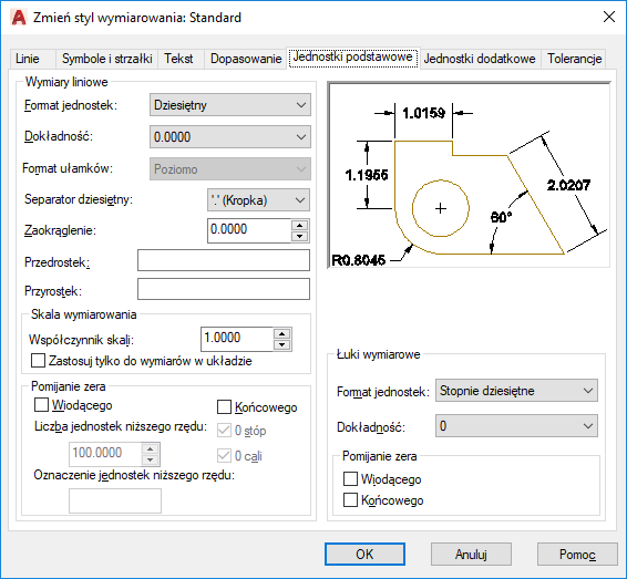 Ustala format i dokładność podstawowych jednostek wymiarowania oraz ustala przedrostki i przyrostki dla tekstu wymiarowego.