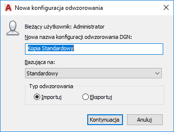 Otwiera okno dialogowe Zmień konfigurację odwzorowania DGN. W zależności od wybranego typu odwzorowania (Import lub Eksport) jest otwierane odpowiednie okno dialogowe importu/eksportu.