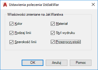 Zmienia nadpisania właściwości koloru, rodzaju linii, szerokości linii, materiału, stylu wydruku i przezroczystości dla wybranych obiektów i wstawionych bloków na odblokowanych warstwach na JakWarstwa.