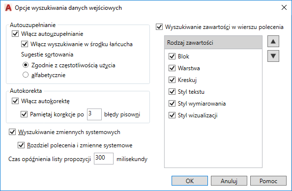 Steruje ustawieniami wyświetlania listy propozycji poleceń, zmiennych systemowych i nazwanej zawartości, takiej jak bloki i warstwy.