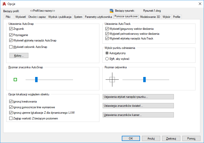 Steruje ustawieniami związanymi z zachowaniem funkcji AutoTrack ™ , które jest dostępne, gdy włączone jest śledzenie biegunowe lub śledzenie lokalizacji względem obiektów (zobacz USTAWIENIARYS).