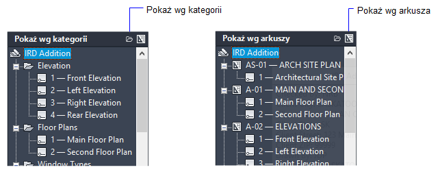 Na karcie Lista arkuszy można łączyć arkusze w zbiory zwane podzestawami. Na karcie Widoki arkuszy można łączyć widoki w zbiory zwane kategoriami.