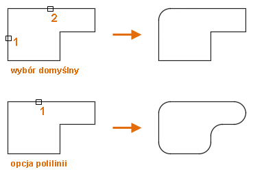 Jeśli opcja Utnij jest włączona i wybrano dwa segmenty polilinii, zaokrąglenie wklęsłe lub wypukłe zostanie połączone z polilinią jako segment łuku.