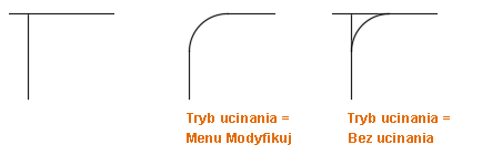 Domyślnie obiekty wybrane w celu zdefiniowania zaokrąglenia wklęsłego lub wypukłego są ucinane lub wydłużane do wynikowego łuku. W celu określenia, czy wybrane obiekty zostaną zmienione czy nie, można użyć opcji Utnij.