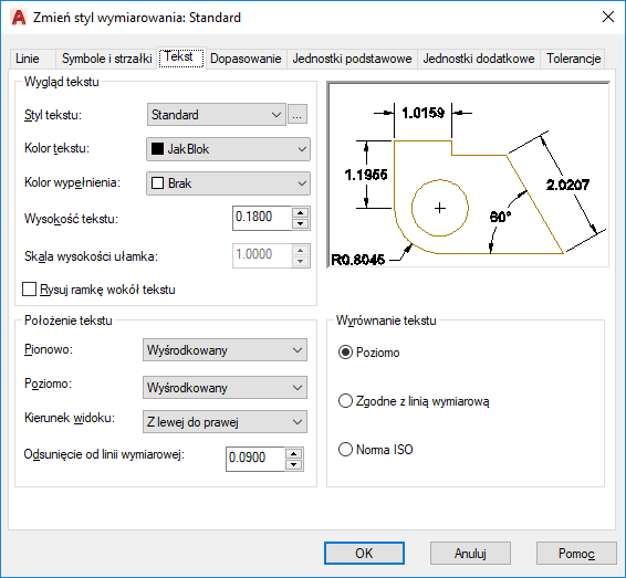 Jeśli styl tekstu określony na tej karcie posiada stałą wysokość tekstu, zastąpi ona wprowadzoną tutaj wartość wysokości tekstu. Jeśli wysokość tekstu wymiaru ma być ustawiona tutaj, należy się upewnić, że wysokość dla stylu tekstu jest ustawiona na 0. Więcej informacji na temat ustawiania wysokości tekstu dla stylów tekstu można znaleźć w opisie polecenia STYL.