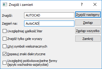 WTEKST (polecenie) Wyszukiwanie : W edytorze tekstu lub z poziomu menu skrótów polecenia WTEKST wybierz opcję Znajdź i zamień