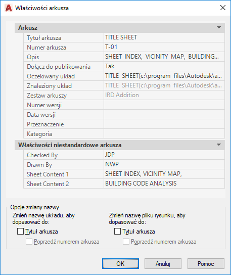 Wyświetla informacje charakterystyczne dla wybranego arkusza, takie jak tytuł arkusza, numer arkusza i określa, czy arkusz ten zostanie objęty operacjami publikowania. Wyświetla również właściwości niestandardowe, jeśli istnieją.
