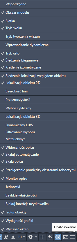 Uwaga: Domyślnie wyświetlanie współrzędnych nie jest wyświetlane na pasku stanu. Aby wyświetlić współrzędne na pasku stanu, wybierz opcję Współrzędne z przycisku Adaptacja na pasku stanu.