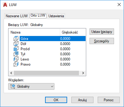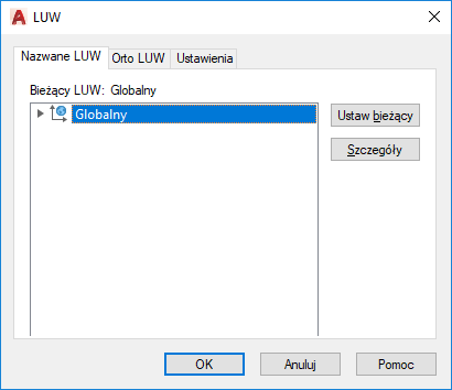 Wyświetla listę układów współrzędnych zdefiniowanych w bieżącym rysunku. Strzałka oznacza bieżący układ LUW.