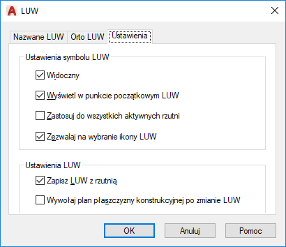 Umożliwia wyświetlenie, zmianę nazwy i przywrócenie definicji układu LUW oraz steruje układami LUW i ustawieniami ich ikon dla rzutni.